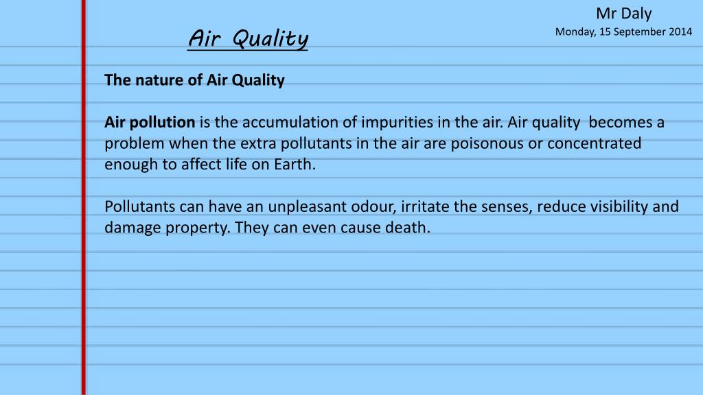 Mr Daly Air Quality The nature of Air Quality Air pollution is the accumulation of impurities in the air. Air quality becomes a problem when the extra pollutants in the air are poisonous or concentrated enough to affect life on Earth. Pollutants can have an unpleasant odour, irritate the senses, reduce visibility and damage property. They can even cause death.