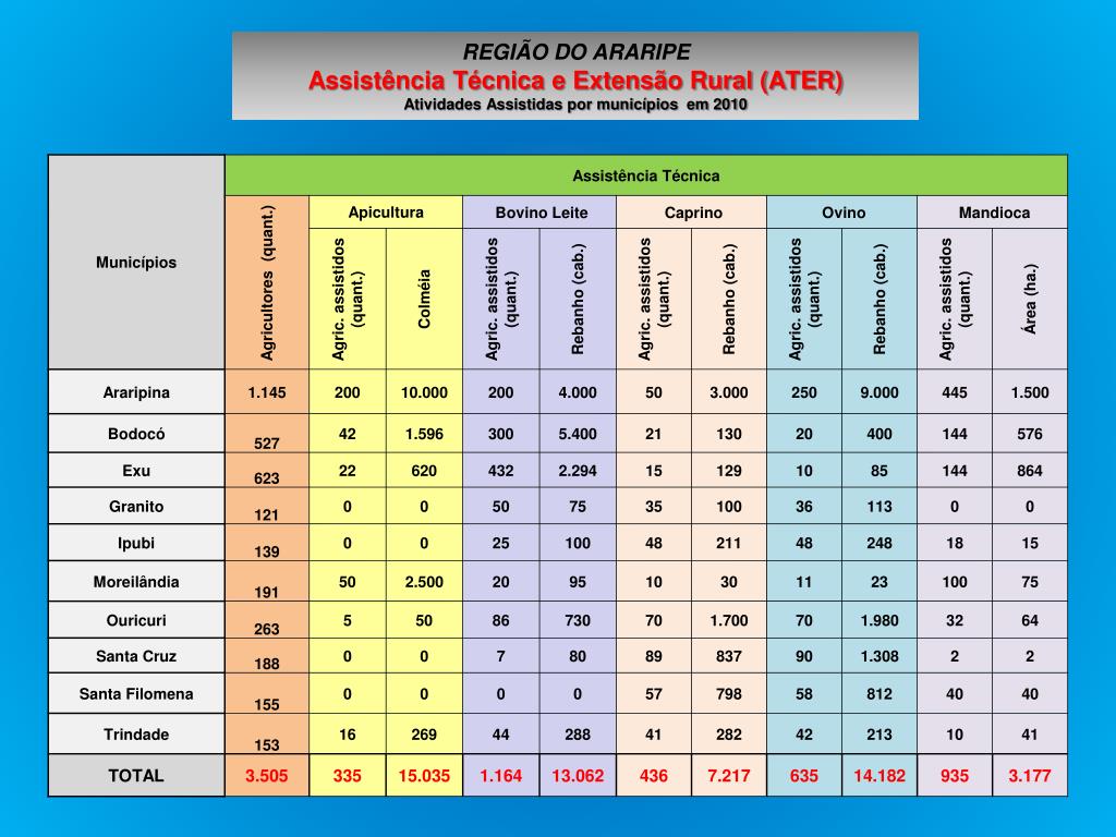 REGIÃO DO ARARIPEAssistência Técnica e Extensão Rural (ATER) Atividades Assistidas por municípios em 2010
