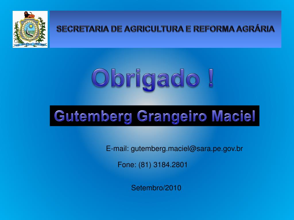 SECRETARIA DE AGRICULTURA E REFORMA AGRÁRIA Obrigado ! GutembergGrangeiro Maciel E-mail: gutemberg.maciel@sara.pe.gov.br Fone: (81) 3184.2801 Setembro/2010