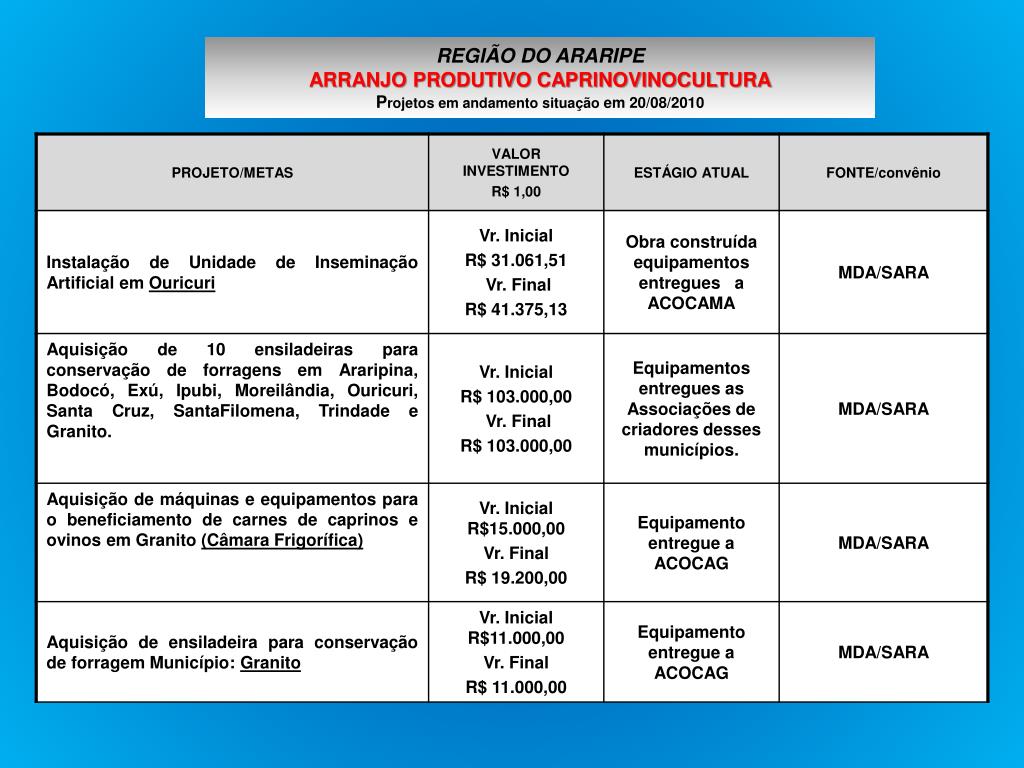 REGIÃO DO ARARIPEARRANJO PRODUTIVO CAPRINOVINOCULTURAProjetos em andamento situação em 20/08/2010