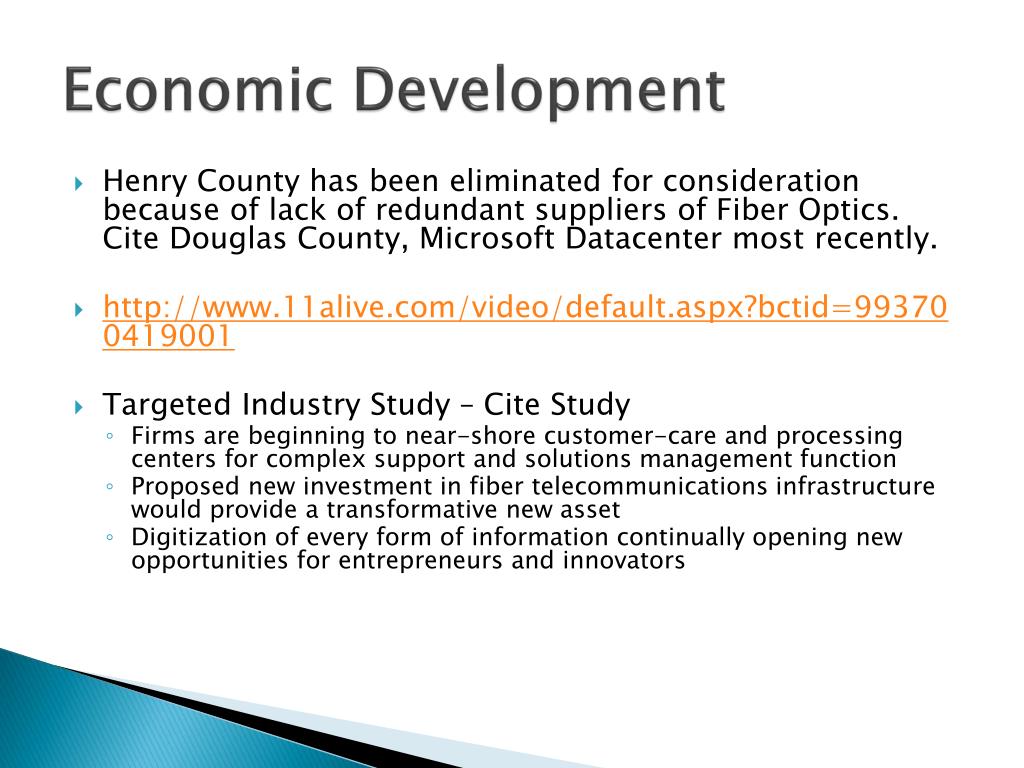 Economic Development • Henry County has been eliminated for consideration because of lack of redundant suppliers of Fiber Optics. Cite Douglas County, Microsoft Datacenter most recently. • http://www.11alive.com/video/default.aspx?bctid=993700419001 • Targeted Industry Study – Cite Study • Firms are beginning to near-shore customer-care and processing centers for complex support and solutions management function • Proposed new investment in fiber telecommunications infrastructure would provide a transformative new asset • Digitization of every form of information continually opening new opportunities for entrepreneurs and innovators
