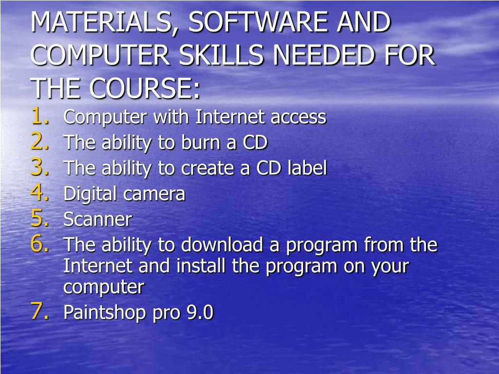 MATERIALS, SOFTWARE AND COMPUTER SKILLS NEEDED FOR THE COURSE: • Computer with Internet access • The ability to burn a CD • The ability to create a CD label • Digital camera • Scanner • The ability to download a program from the Internet and install the program on your computer • Paintshop pro 9.0