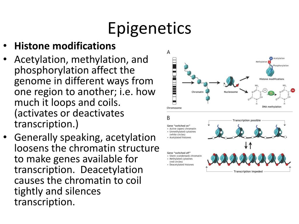 Epigenetics • Histone modifications • Acetylation, methylation, and phosphorylation affect the genome in different ways from one region to another; i.e. how much it loops and coils. (activates or deactivates transcription.) • Generally speaking, acetylation loosens the chromatin structure to make genes available for transcription. Deacetylation causes the chromatin to coil tightly and silences transcription.