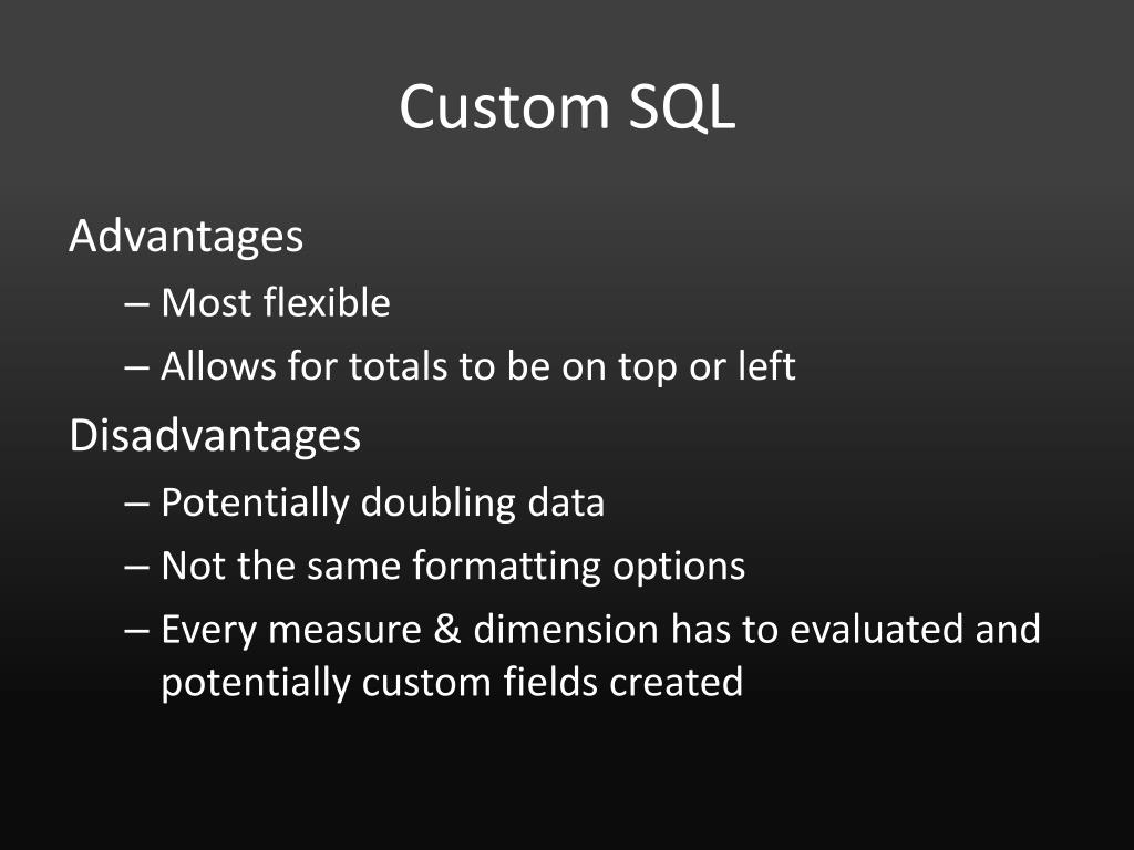 Custom SQL Advantages • Most flexible • Allows for totals to be on top or left Disadvantages • Potentially doubling data • Not the same formatting options • Every measure & dimension has to evaluated and potentially custom fields created