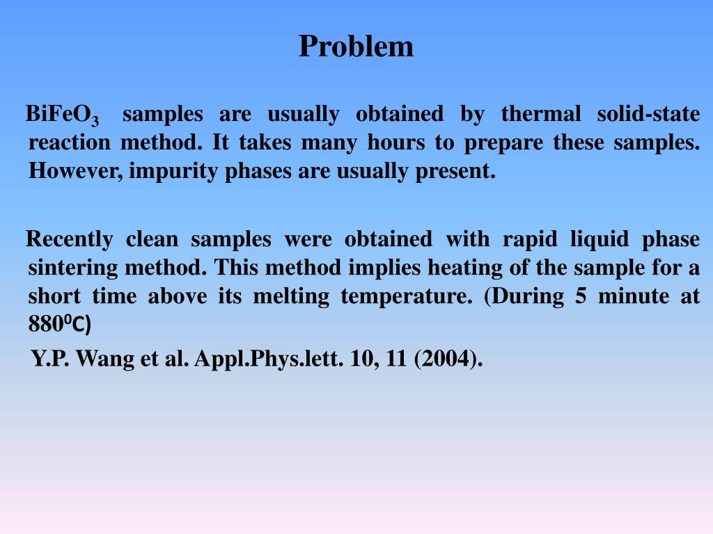 Problem BiFeO3 samples are usually obtained by thermal solid-state reaction method. It takes many hours to prepare these samples. However, impurity phases are usually present. Recently clean samples were obtained with rapid liquid phase sintering method. This method implies heating of the sample for a short time above its melting temperature. (During 5 minute at 8800C) Y.P. Wang et al. Appl.Phys.lett. 10, 11 (2004).
