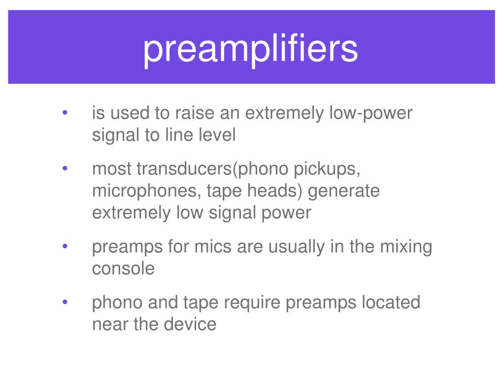 preamplifiers • is used to raise an extremely low-power signal to line level • most transducers(phono pickups, microphones, tape heads) generate extremely low signal power • preamps for mics are usually in the mixing console • phono and tape require preamps located near the device