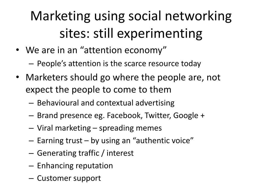 Marketing using social networking sites: still experimenting • We are in an “attention economy” • People’s attention is the scarce resource today • Marketers should go where the people are, not expect the people to come to them • Behavioural and contextual advertising • Brand presence eg. Facebook, Twitter, Google + • Viral marketing – spreading memes • Earning trust – by using an “authentic voice” • Generating traffic / interest • Enhancing reputation • Customer support