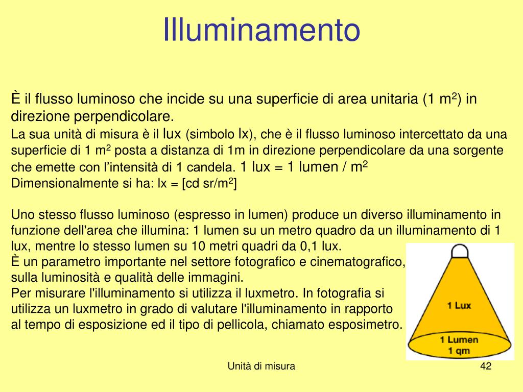 Illuminamento È il flusso luminoso che incide su una superficie di area unitaria (1 m2) in direzione perpendicolare. La sua unità di misura è il lux (simbolo lx), che è il flusso luminoso intercettato da una superficie di 1 m2 posta a distanza di 1m in direzione perpendicolare da una sorgente che emette con l’intensità di 1 candela. 1 lux = 1 lumen / m2 Dimensionalmente si ha: lx = [cd sr/m2] Uno stesso flusso luminoso (espresso in lumen) produce un diverso illuminamento in funzione dell'area che illumina: 1 lumen su un metro quadro da un illuminamento di 1 lux, mentre lo stesso lumen su 10 metri quadri da 0,1 lux. È un parametro importante nel settore fotografico e cinematografico, poiché influisce sulla luminosità e qualità delle immagini. Per misurare l'illuminamento si utilizza il luxmetro. In fotografia si utilizza un luxmetro in grado di valutare l'illuminamento in rapporto al tempo di esposizione ed il tipo di pellicola, chiamato esposimetro. Unità di misura