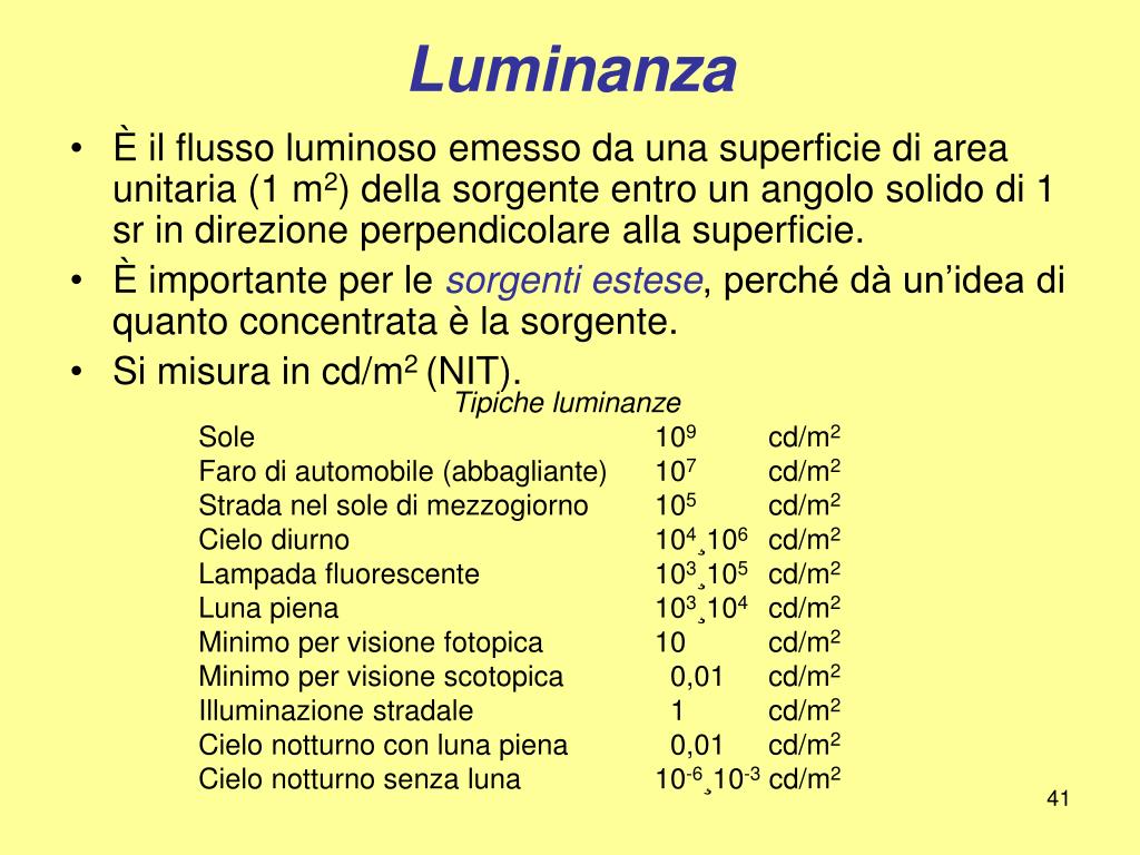 Luminanza • È il flusso luminoso emesso da una superficie di area unitaria (1 m2) della sorgente entro un angolo solido di 1 sr in direzione perpendicolare alla superficie. • È importante per le sorgenti estese, perché dà un’idea di quanto concentrata è la sorgente. • Si misura in cd/m2 (NIT). Tipiche luminanze Sole 109 cd/m2 Faro di automobile (abbagliante) 107 cd/m2 Strada nel sole di mezzogiorno 105 cd/m2 Cielo diurno 104¸106 cd/m2 Lampada fluorescente 103¸105 cd/m2 Luna piena 103¸104 cd/m2 Minimo per visione fotopica 10 cd/m2 Minimo per visione scotopica 0,01 cd/m2 Illuminazione stradale 1 cd/m2 Cielo notturno con luna piena 0,01 cd/m2 Cielo notturno senza luna 10-6¸10-3 cd/m2