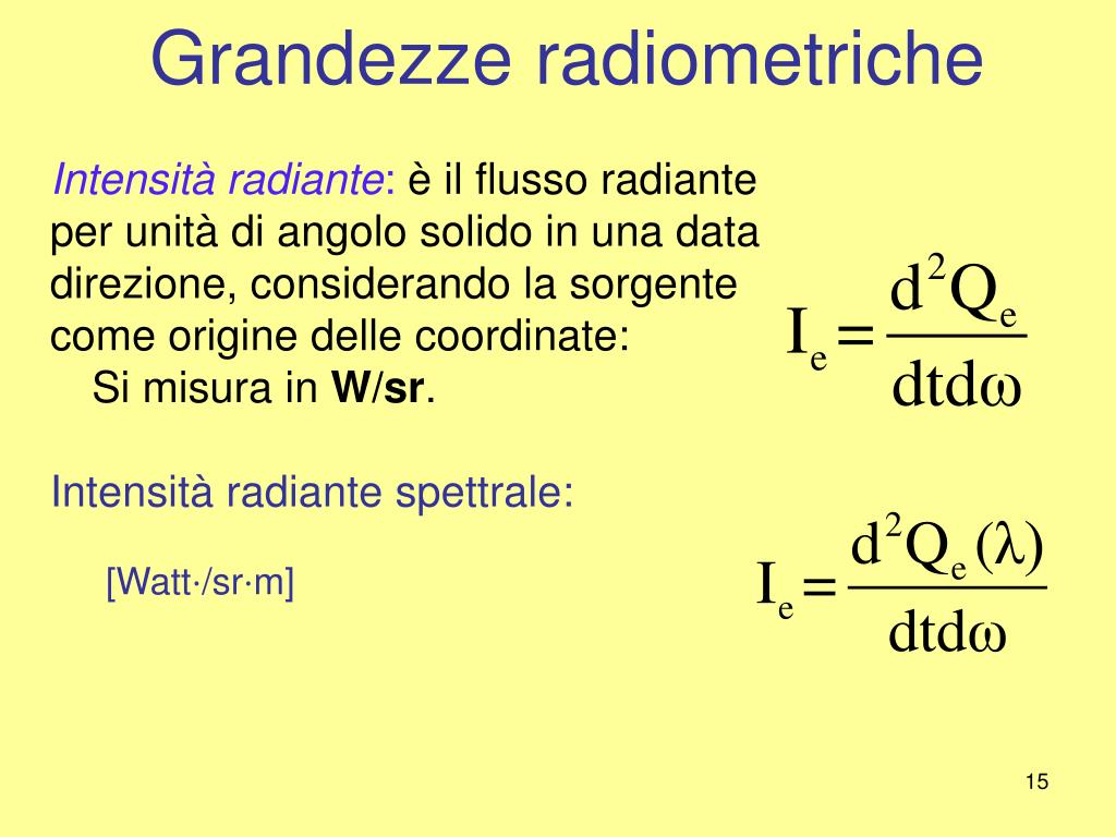 Grandezze radiometriche Intensità radiante: è il flusso radiante per unità di angolo solido in una data direzione, considerando la sorgente come origine delle coordinate: Si misura in W/sr. Intensità radiante spettrale: [Watt⋅/sr⋅m]