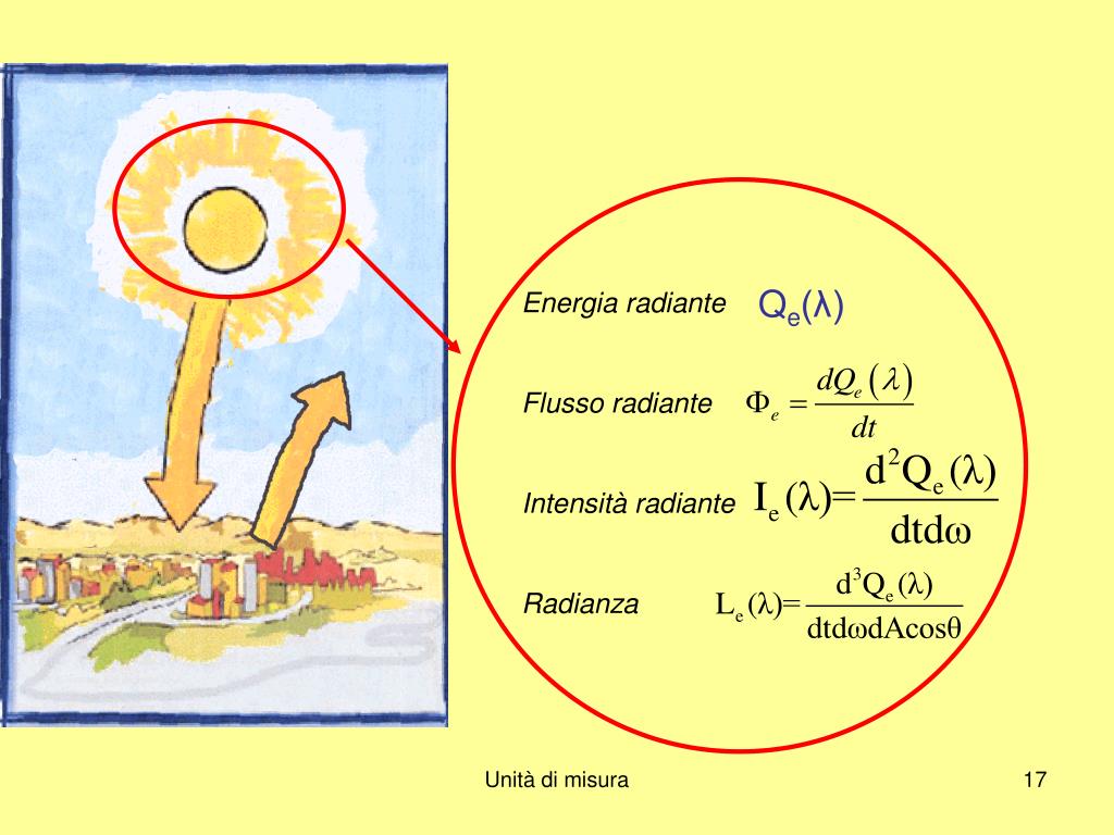 Grandezze radiometriche Irradianza: è definita come il flusso radiante per superficie di rivelazione unitaria si misura in W/m2. L’Irradianza che cade su una superficie varia con il coseno dell’angolo di incidenza Irradianzaspettrale Unità di misura