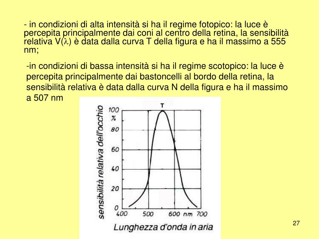 - in condizioni di alta intensità si ha il regime fotopico: la luce è percepita principalmente dai coni al centro della retina, la sensibilità relativa V(l) è data dalla curva T della figura e ha il massimo a 555 nm; • - in condizioni di bassa intensità si ha il regime scotopico: la luce è percepita principalmente dai bastoncelli al bordo della retina, la sensibilità relativa è data dalla curva N della figura e ha il massimo a 507 nm Unità di misura