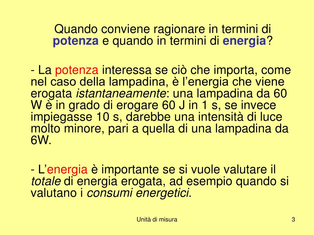Quando conviene ragionare in termini di potenzae quando in termini di energia? - La potenza interessa se ciò che importa, come nel caso della lampadina, è l’energia che viene erogata istantaneamente: una lampadina da 60 W è in grado di erogare 60 J in 1 s, se invece impiegasse 10 s, darebbe una intensità di luce molto minore, pari a quella di una lampadina da 6W. - L’energia è importante se si vuole valutare il totale di energia erogata, ad esempio quando si valutano i consumi energetici. Unità di misura
