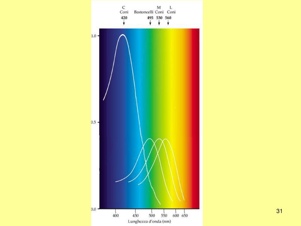 3 Tipi di Coni • coni L, più sensibili alla luce rossa (610 nm) • coni M, più sensibili alla luce verde (560 nm) • coni S, più sensibili alla luce blu (430 nm) Unità di misura