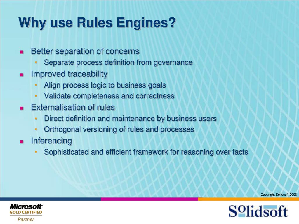 Why use Rules Engines? • Better separation of concerns • Separate process definition from governance • Improved traceability • Align process logic to business goals • Validate completeness and correctness • Externalisation of rules • Direct definition and maintenance by business users • Orthogonal versioning of rules and processes • Inferencing • Sophisticated and efficient framework for reasoning over facts
