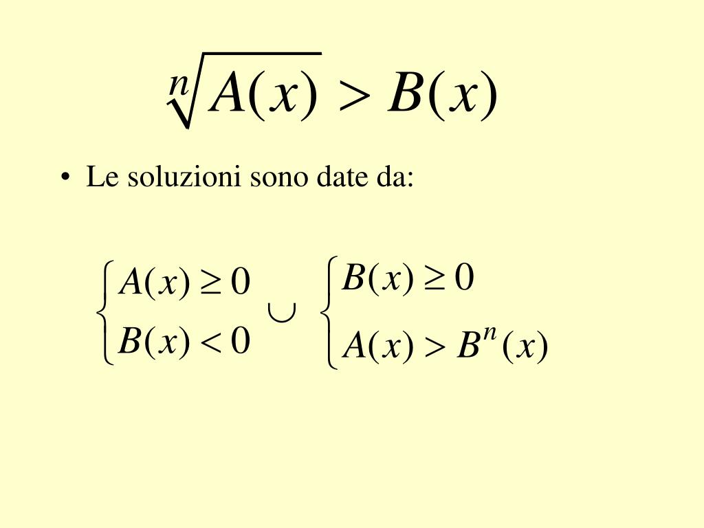 DISEQUAZIONI IRRAZIONALI • Una disequazione in cui l’incognita compare almeno una volta sotto il segno di radice. • Distinguiamo due casi: • n dispari • n pari