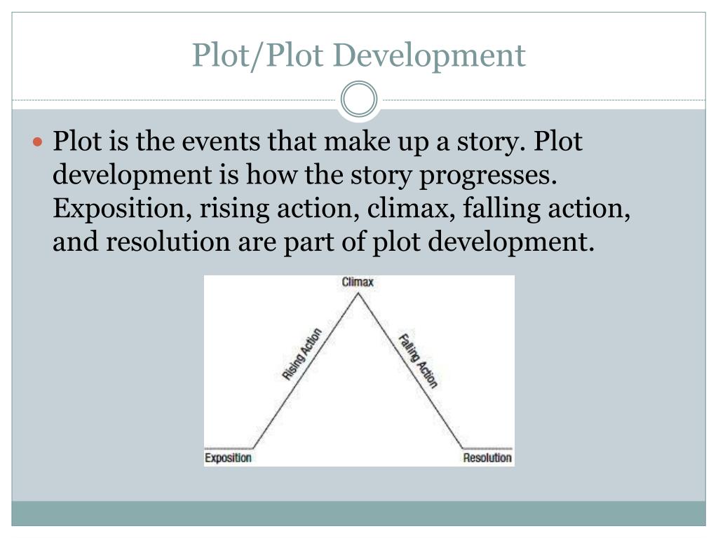 Plot/Plot Development Plot is the events that make up a story. Plot development is how the story progresses. Exposition, rising action, climax, falling action, and resolution are part of plot development.