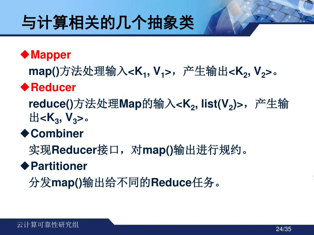 与计算相关的几个抽象类 • Mapper map()方法处理输入<K1, V1>,产生输出<K2, V2>。 • Reducer reduce()方法处理Map的输入<K2, list(V2)>,产生输出<K3, V3>。 • Combiner 实现Reducer接口,对map()输出进行规约。 • Partitioner 分发map()输出给不同的Reduce任务。 云计算可靠性研究组