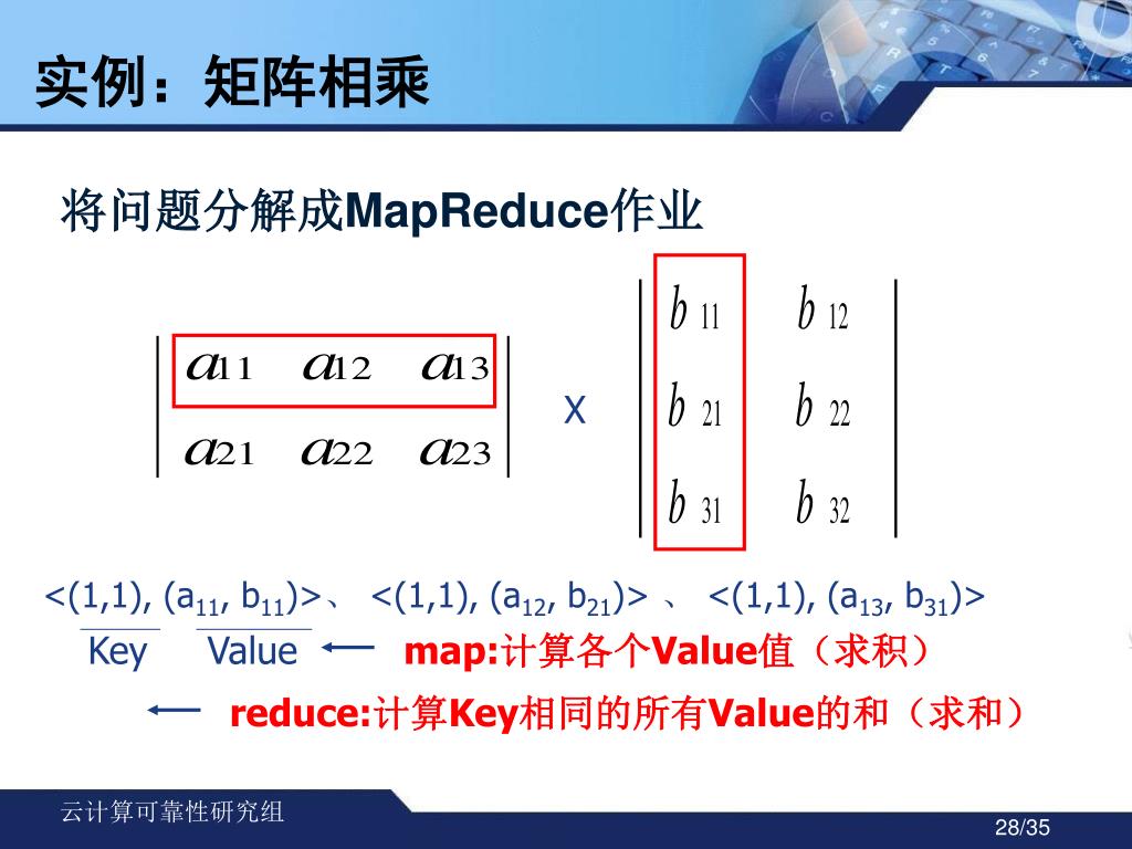 map:计算各个Value值(求积) reduce:计算Key相同的所有Value的和(求和) 实例:矩阵相乘 将问题分解成MapReduce作业 X <(1,1), (a11, b11)>、 <(1,1), (a12, b21)> 、 <(1,1), (a13, b31)> Key Value 云计算可靠性研究组