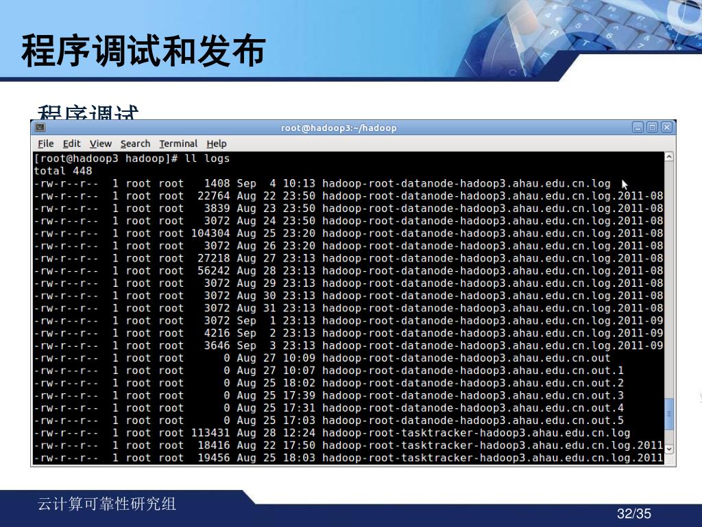 程序调试和发布 程序调试 • 编写单元测试(Mockito)。 • 将调试语句记录到错误日志中。(StatusReporter) • 日志文件:分门别类存放在hadoop-version/logs目录下面,hadoop-username-service-hostname.log,尤其关注TaskTracker的log。 • 在单机上首先执行,看看是否能够正确执行,而后再在多机的集群系统上执行。 云计算可靠性研究组