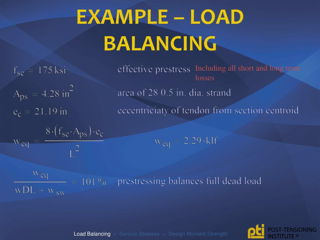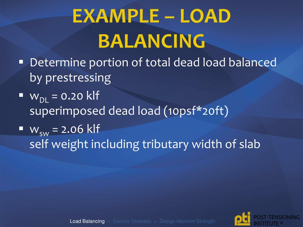 Example – Load balancing • Determine portion of total dead load balanced by prestressing • wDL = 0.20 klfsuperimposed dead load (10psf*20ft) • wsw = 2.06 klfself weight including tributary width of slab Load Balancing > Service Stresses > Design Moment Strength