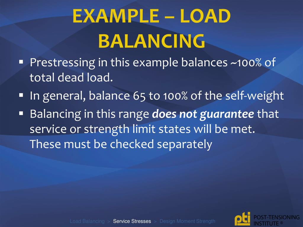 Example – Load balancing • Prestressing in this example balances ~100% of total dead load. • In general, balance 65 to 100% of the self-weight • Balancing in this range does not guarantee that service or strength limit states will be met. These must be checked separately Load Balancing > Service Stresses > Design Moment Strength