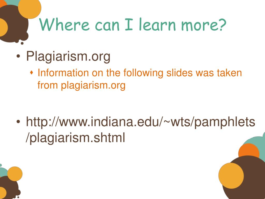 Where can I learn more? • Plagiarism.org • Information on the following slides was taken from plagiarism.org • http://www.indiana.edu/~wts/pamphlets/plagiarism.shtml