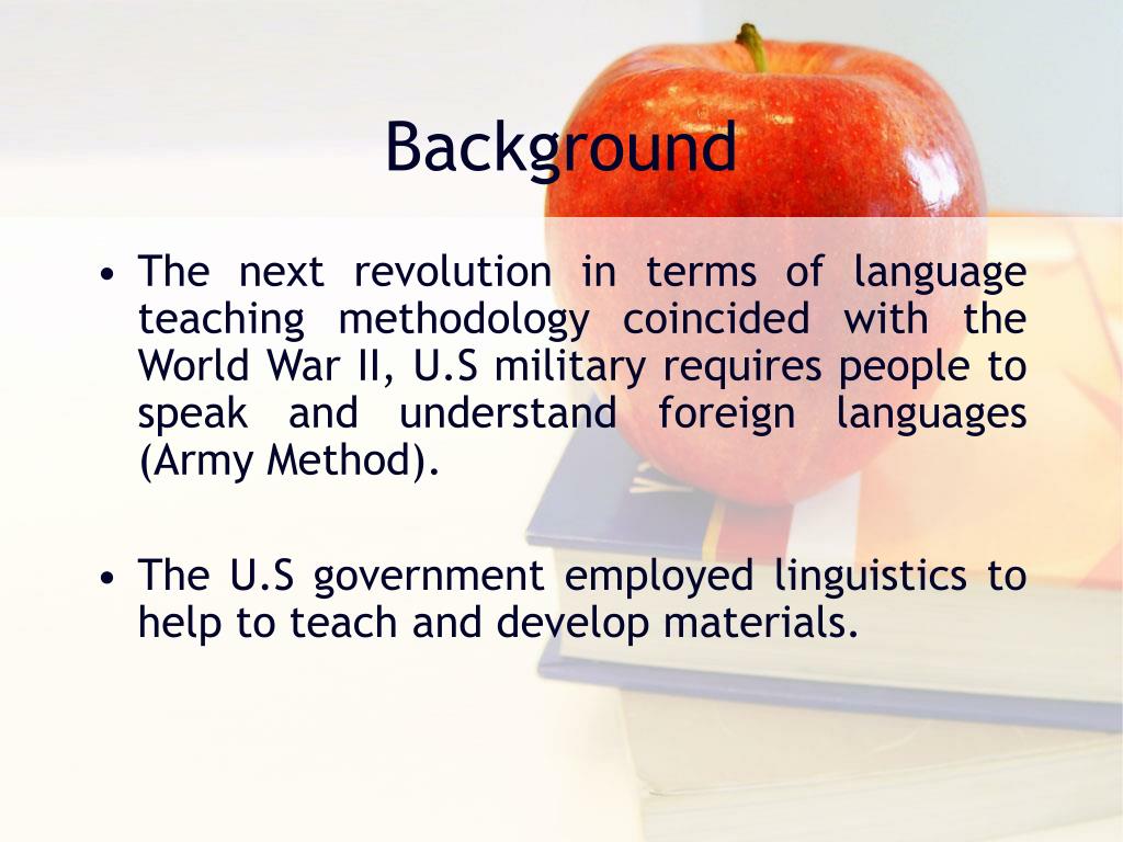 Background • The next revolution in terms of language teaching methodology coincided with the World War II, U.S military requires people to speak and understand foreign languages (Army Method). • The U.S government employed linguistics to help to teach and develop materials.