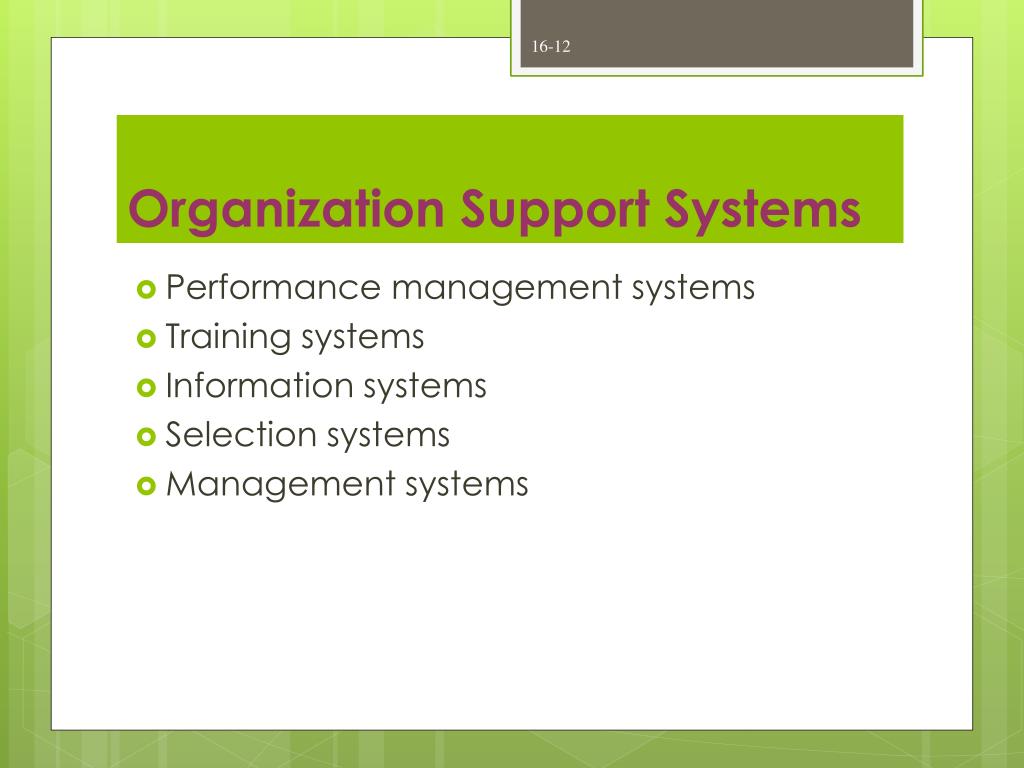 Organization Support Systems • Performance management systems • Training systems • Information systems • Selection systems • Management systems