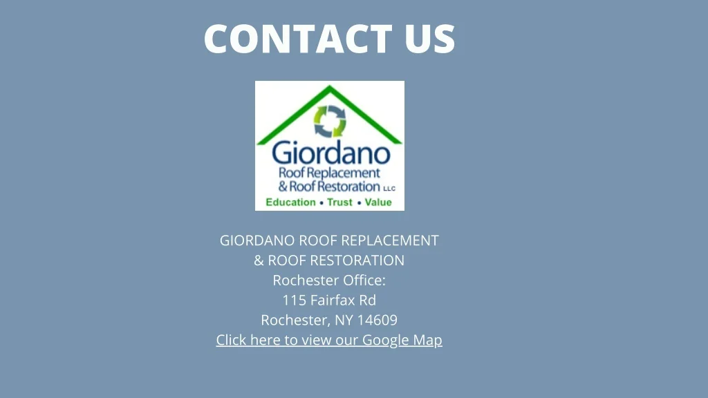 CONTACT US GIORDANO ROOF REPLACEMENT & ROOF RESTORATION Rochester Office: 115 Fairfax Rd Rochester, NY 14609 Click here to view our Google Map