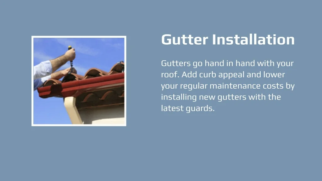Gutter Installation Gutters go hand in hand with your roof. Add curb appeal and lower your regular maintenance costs by installing new gutters with the latest guards.