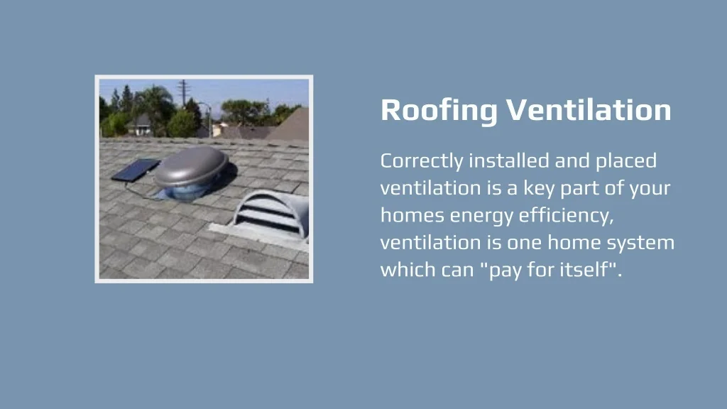 Roofing Ventilation Correctly installed and placed ventilation is a key part of your homes energy efficiency, ventilation is one home system which can "pay for itself".