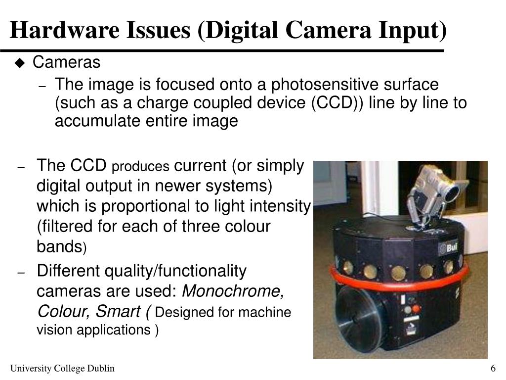 Hardware Issues (Digital Camera Input) • Cameras • The image is focused onto a photosensitive surface (such asa charge coupled device (CCD)) line by line to accumulate entire image • The CCD produces current (or simply digital output in newer systems) which is proportional to light intensity (filtered for each of three colour bands) • Different quality/functionality cameras are used:Monochrome, Colour, Smart ( Designed for machine vision applications )