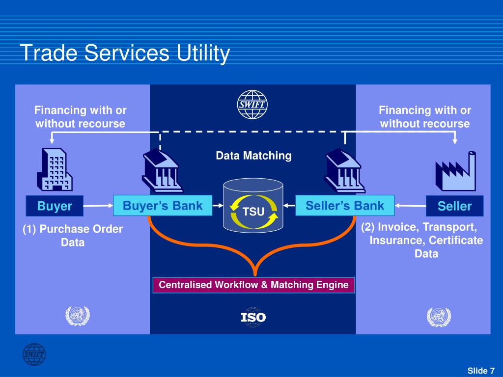 Buyer Buyer’s Bank Seller’s Bank TSU Trade Services Utility Financing with or without recourse Financing with or without recourse Data Matching Seller (2) Invoice, Transport, Insurance, Certificate Data (1) Purchase Order Data Centralised Workflow & Matching Engine