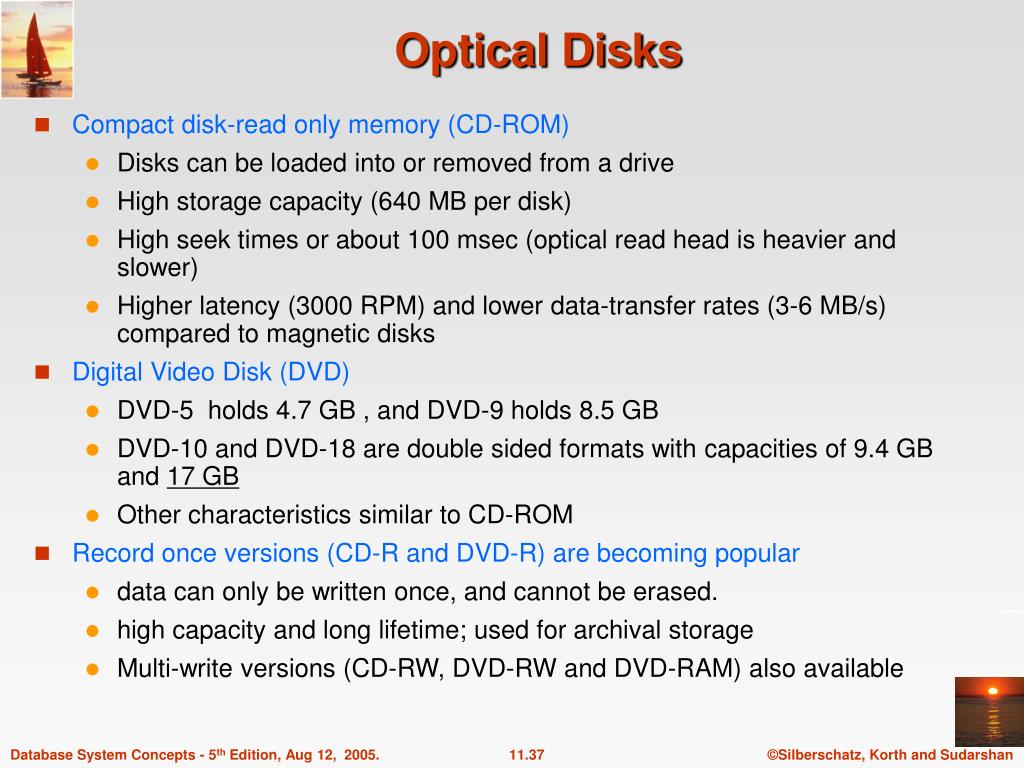 Physical Storage Media (Cont.) • Optical storage • non-volatile, data is read optically from a spinning disk using a laser • CD-ROM (640 MB) and DVD (4.7 to 17 GB) are most popular forms • Write-one, read-many (WORM) optical disks used for archival storage (CD-R and DVD-R) • Multiple write versions also available (CD-RW, DVD-RW, and DVD-RAM) • Reads and writes are slower than with magnetic disk • Juke-box systems • large numbers of removable disks and a few drives • a mechanism for automatic loading/unloading of disks available for storing large volumes of data