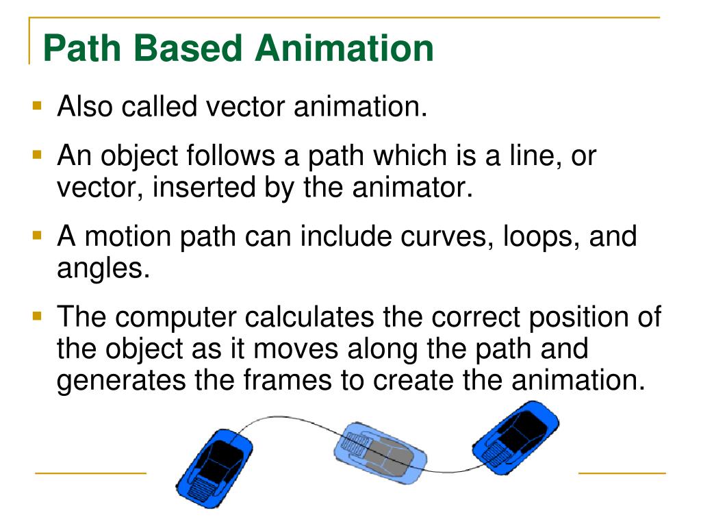 Path Based Animation Also called vector animation. An object follows a path which is a line, or vector, inserted by the animator. A motion path can include curves, loops, and angles. The computer calculates the correct position of the object as it moves along the path and generates the frames to create the animation.