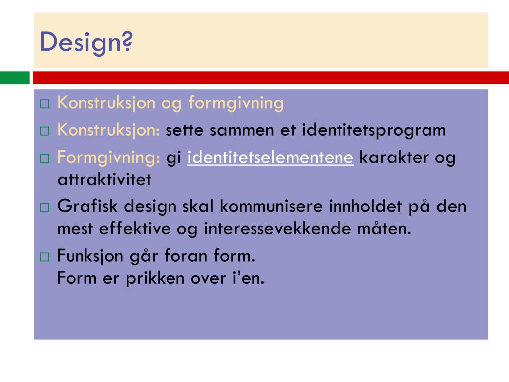 Design? • Konstruksjon og formgivning • Konstruksjon: sette sammen et identitetsprogram • Formgivning: gi identitetselementene karakter og attraktivitet • Grafisk design skal kommunisere innholdet på den mest effektive og interessevekkende måten. • Funksjon går foran form. Form er prikken over i’en.
