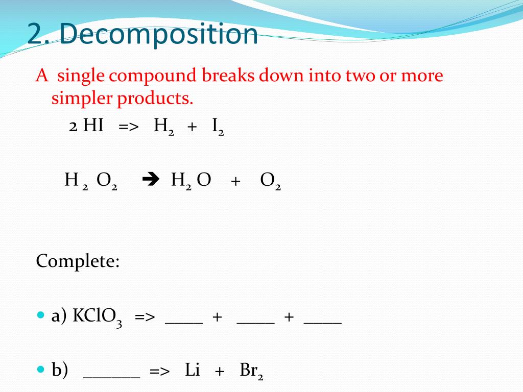 2. Decomposition A single compound breaks down into two or more simpler products. 2 HI => H2 + I2 H 2 O2 H2 O + O2 Complete: • a) KClO3 => ____ + ____ + ____ • b) ______ => Li + Br2
