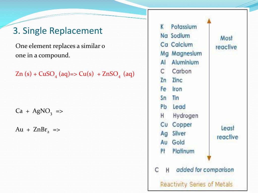 3. Single Replacement One element replaces a similar o one in a compound. Zn (s) + CuSO4 (aq)=> Cu(s) + ZnSO4 (aq) Ca + AgNO3 => Au + ZnBr2 =>