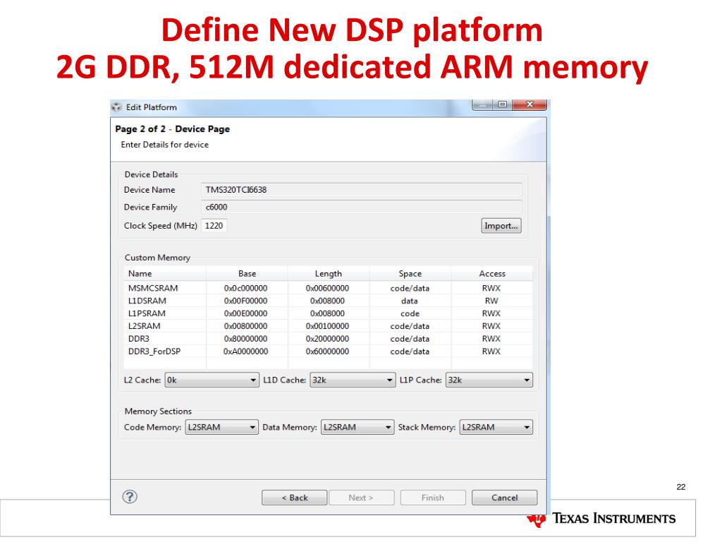 DSP definition in Device Tree For each C66 CorePac, 7 memory allocations: Address of Core control registers (boot address, power) L1 P global memory address L1 D global memory address L2 global memory address In addition, the MSM memory address and DDR addresses that are dedicated to DSP usage are defined. DSP code that uses DDR must use ONLY the DDR addresses that are assigned to it