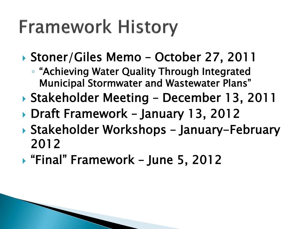 Framework History • Stoner/Giles Memo – October 27, 2011 • “Achieving Water Quality Through Integrated Municipal Stormwater and Wastewater Plans” • Stakeholder Meeting – December 13, 2011 • Draft Framework – January 13, 2012 • Stakeholder Workshops – January-February 2012 • “Final” Framework – June 5, 2012