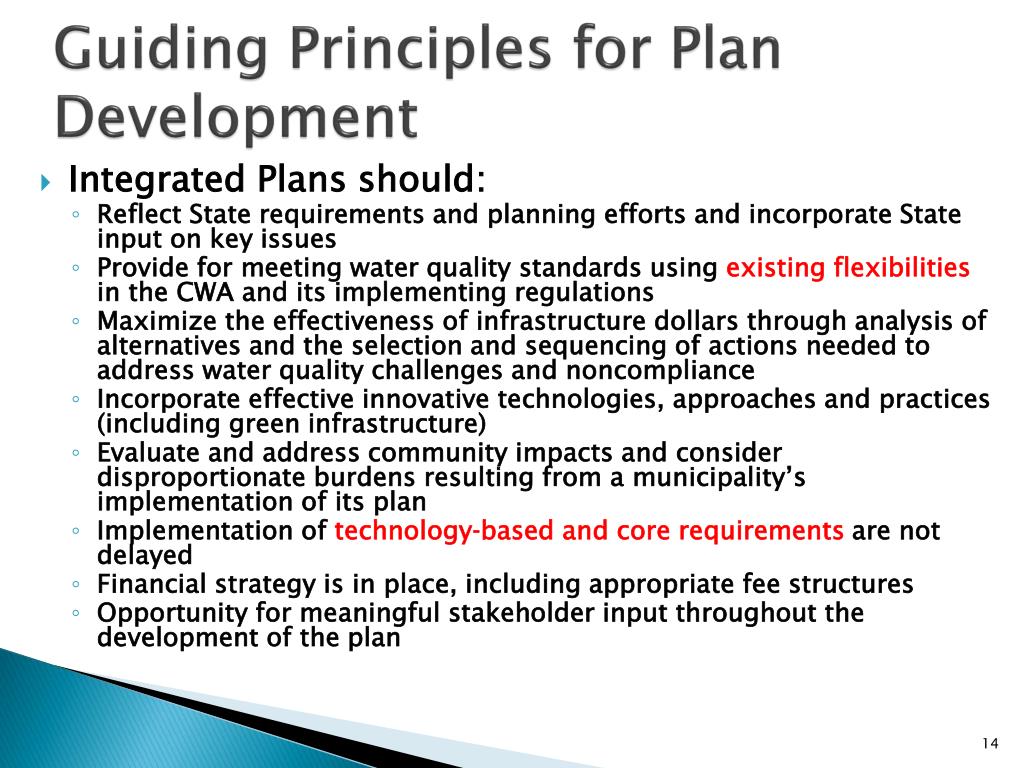 Guiding Principles for Plan Development • Integrated Plans should: • Reflect State requirements and planning efforts and incorporate State input on key issues • Provide for meeting water quality standards using existing flexibilities in the CWA and its implementing regulations • Maximize the effectiveness of infrastructure dollars through analysis of alternatives and the selection and sequencing of actions needed to address water quality challenges and noncompliance • Incorporate effective innovative technologies, approaches and practices (including green infrastructure) • Evaluate and address community impacts and consider disproportionate burdens resulting from a municipality’s implementation of its plan • Implementation of technology‐based and core requirements are not delayed • Financial strategy is in place, including appropriate fee structures • Opportunity for meaningful stakeholder input throughout the development of the plan