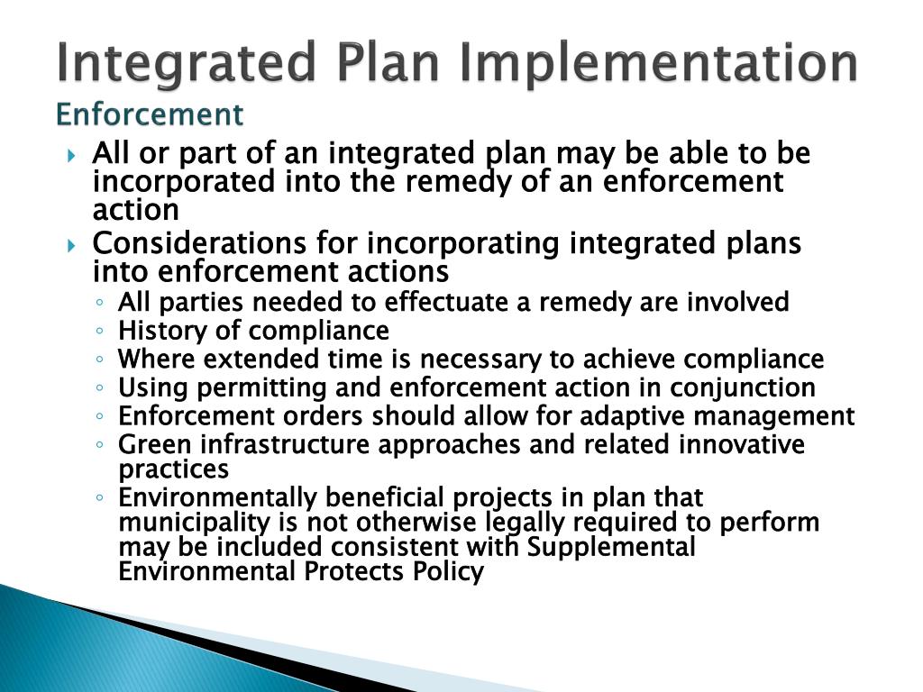 Integrated Plan Implementation Enforcement • All or part of an integrated plan may be able to be incorporated into the remedy of an enforcement action • Considerations for incorporating integrated plans into enforcement actions • All parties needed to effectuate a remedy are involved • History of compliance • Where extended time is necessary to achieve compliance • Using permitting and enforcement action in conjunction • Enforcement orders should allow for adaptive management • Green infrastructure approaches and related innovative practices • Environmentally beneficial projects in plan that municipality is not otherwise legally required to perform may be included consistent with Supplemental Environmental Protects Policy
