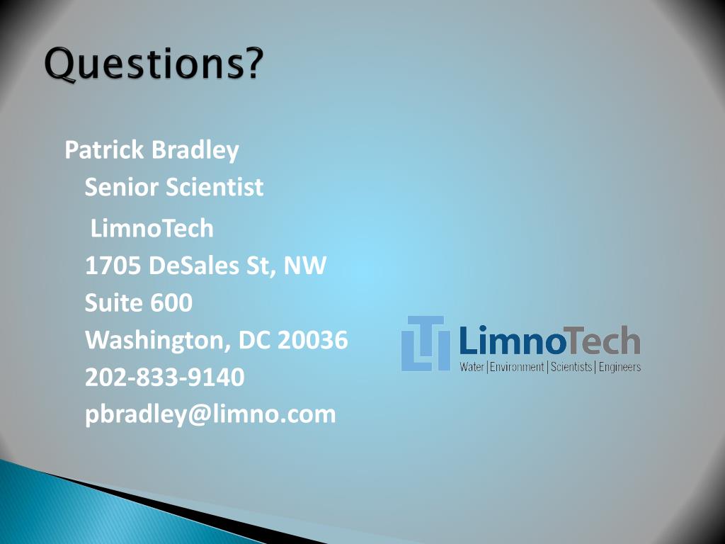 Questions? Patrick BradleySenior Scientist LimnoTech1705 DeSales St, NW Suite 600Washington, DC 20036202-833-9140pbradley@limno.com