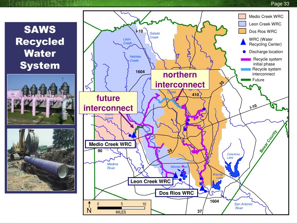 Recycle system initial phase Recycle system interconnect Future 0 5 10 N MILES Medio Creek WRC Leon Creek WRC SAWS Recycled Water System I-10 Dos Rios WRC Salado Creek Leon Creek WRC (Water Recycling Center) Discharge location Helotes Creek 281 1604 northern interconnect 35 Olmos Creek 410 future interconnect I-10 Medio Creek Bexar County Medio Creek WRC 35 90 Calaveras Lake Medina River Mitchell Lake Braunig Lake Leon Creek WRC Dos Rios WRC 1604 San Antonio River 37