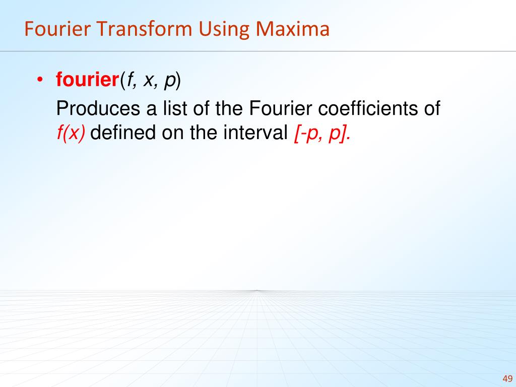 Fourier Transform Using Maxima • fourier(f, x, p) Produces a list of the Fourier coefficients of f(x) defined on the interval [-p, p].