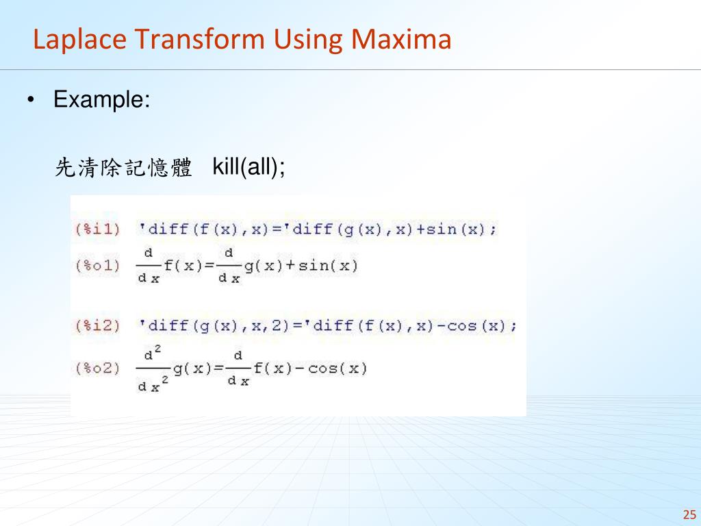 Laplace Transform Using Maxima • Example (cont.): (“%o?” should be consistent with the output on your computer) (“diff” in %i6 means all the differentiations are carried out)