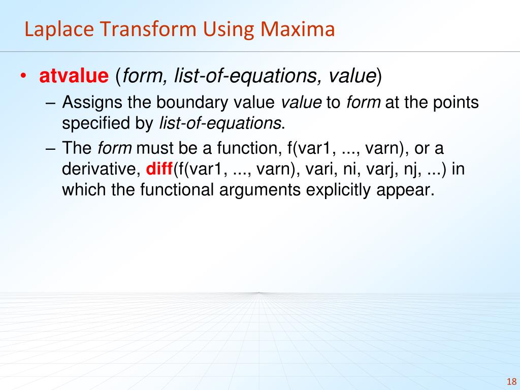 Laplace Transform Using Maxima • atvalue (form, list-of-equations, value) • Assigns the boundary value value to form at the points specified by list-of-equations. • The form must be a function, f(var1, ..., varn), or a derivative, diff(f(var1, ..., varn), vari, ni, varj, nj, ...) in which the functional arguments explicitly appear.