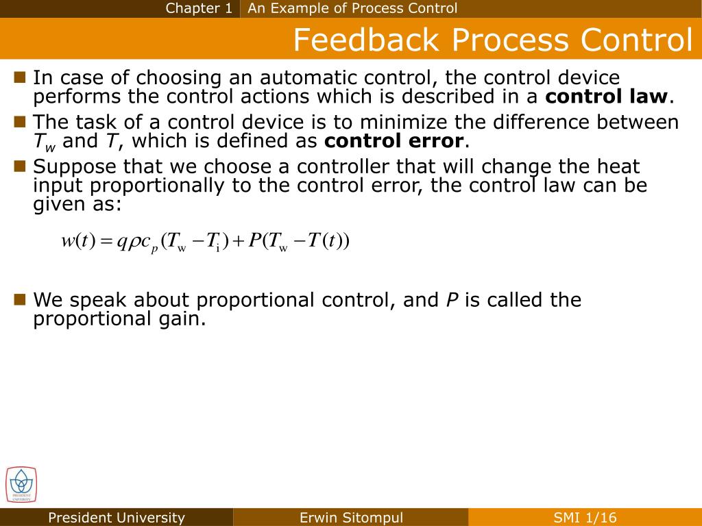 Chapter 1 An Example of Process Control Feedback Process Control • In case of choosing an automatic control, the control device performs the control actions which is described in a control law. • The task of a control device is to minimize the difference between Tw and T, which is defined as control error. • Suppose that we choose a controller that will change the heat input proportionally to the control error, the control law can be given as: • We speak about proportional control, and P is called the proportional gain.