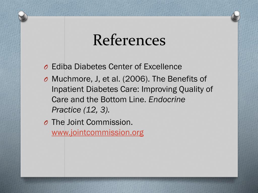 References • Ediba Diabetes Center of Excellence • Muchmore, J, et al. (2006). The Benefits of Inpatient Diabetes Care: Improving Quality of Care and the Bottom Line. Endocrine Practice (12, 3). • The Joint Commission. www.jointcommission.org
